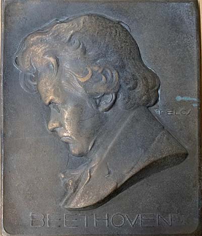 (1921). Ter ere van Ludwig van Beethoven. Door Eduard Telcs. Eénzijdige gegoten plaquette, 18,8 x 15 cm. [0,83 kg.!] met buste van Van Beethoven naar links. Vgl. KB II-120; vgl. Niggl I-42.258. Zeer fraai. € 125,00 |