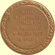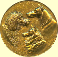 drie hondenkoppen: een poedel, duitse dog en keeshond. Kz. op- en omschrift. Brons verguld 50 mm. Prachtig. € 35,00 N.B. Vervaardigd bij de firma Oertel, Berlijn. |