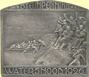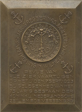 1923. 25-Jarig regeringsjubileum koningin Wilhelmina & 75-jarig Kon. Nederlandsche Zeil- en Roeivereeniging. Door (J.C. Wienecke). Vz. oranjeboom in medaillon omgeven door vier gekroonde ankers. Kz. glad. Brons 79 x 59 mm., KB II-339; CJCW 221a. Prachtig. € 40,00 |