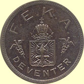 Vz. Deventer stadswapen tussen twee mercuriusstaven. Kz. zesregelig
