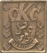 (ca. 1926). Prijspenning Combinatie Kynologen Clubs Overijssel. Vz. hartschild met wapen van Overijssel onder CKC. Links de wapens van Enschede, Deventer, Steenwijk en Hellendoorn; rechts van Zwolle, Almelo, Hengelo en Rijssen. Kz. blanco (veel krassen). Brons rechthoekig 44,2 x 39,5 mm. Prachtig. € 25,00 |
